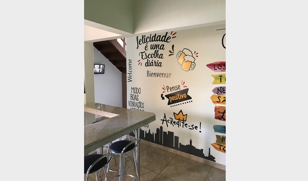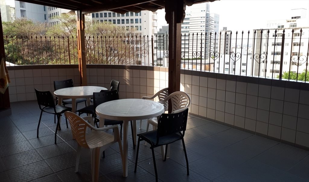 Temos duas cozinhas (uma em cada andar) e duas áreas de lavanderia (uma em cada andar). Temos também uma área de estar, com mesas e cadeiras, televisão com acesso a canais abertos de TV.