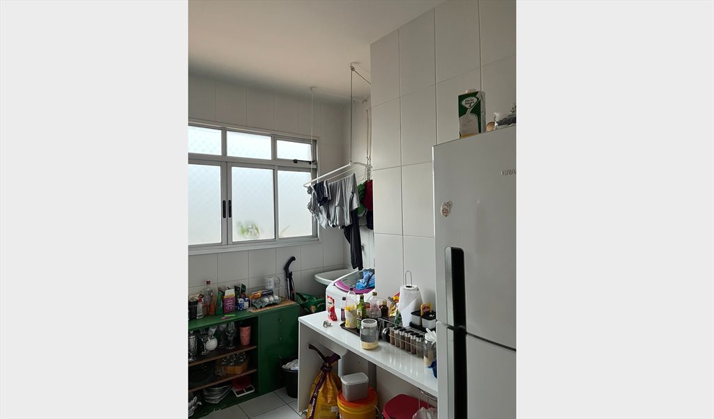 fogão 4 bocas, airfryer, geladeira, máquina de lavar, varal, armários de louça e mantimento;
