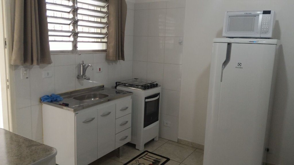 A kitnet possui geladeira, pia, fogão, forno micro-ondas, guarda-roupa, cama de casal com colchão, mesa e cadeira para estudo, ventilador de teto, banheiro com box de vidro.