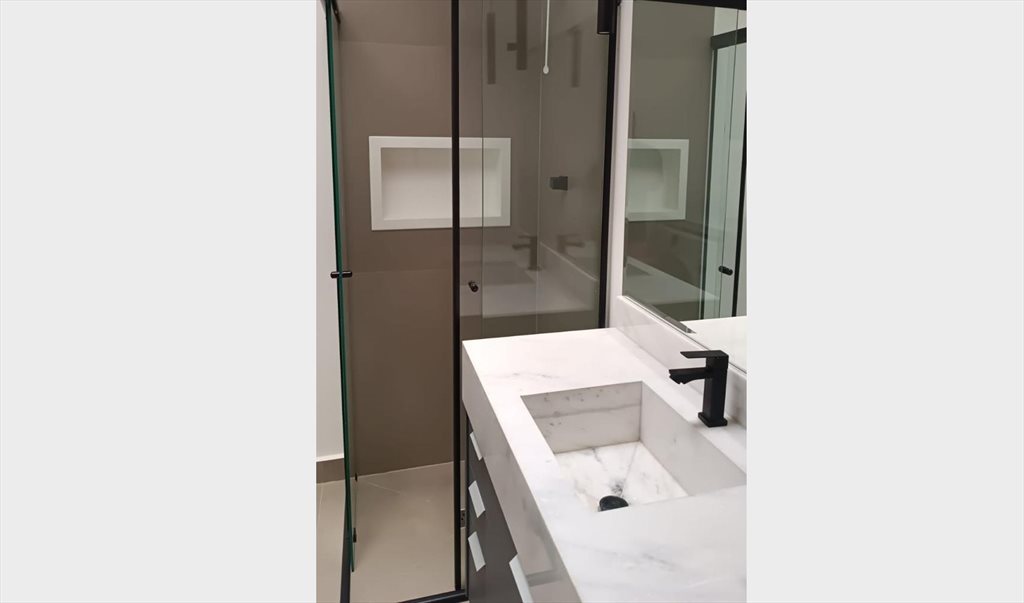 Banheiro completo com armário e box blindex