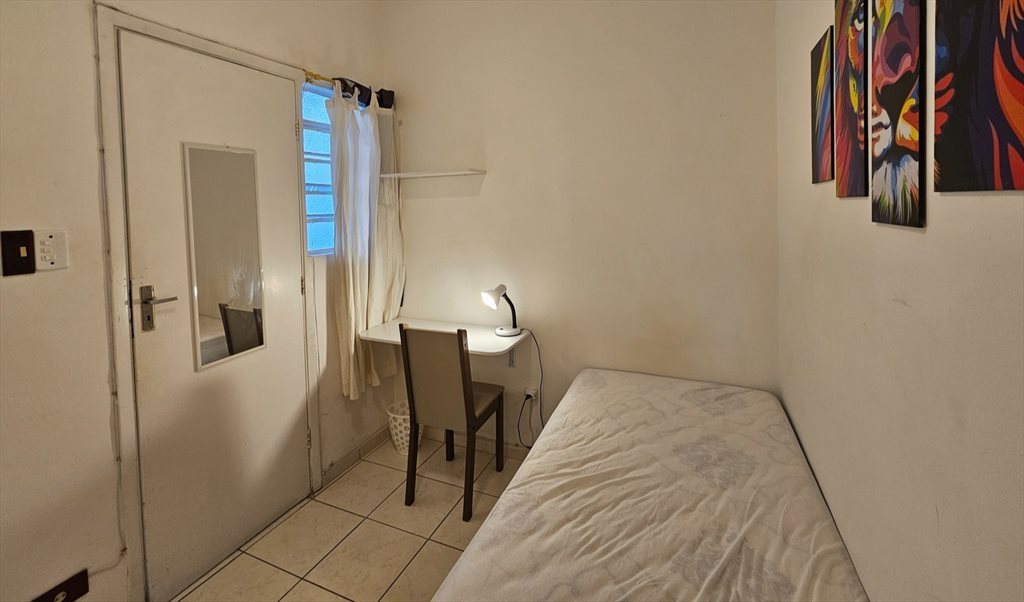 O quarto mobiliado com cama de solteiro, mesa e cadeira de estudo, guarda roupa amplo.