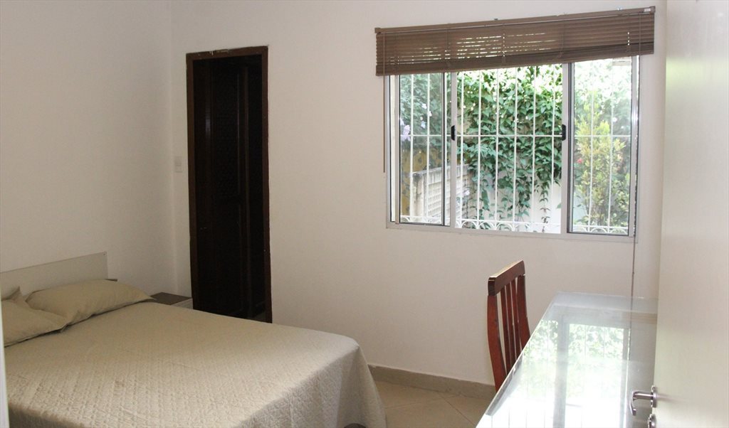 Quarto com cama de casal, mesa, cadeira, armário, em uma casa com banheiro, sala, cozinha, churrasqueira compartilhadas