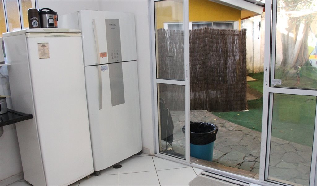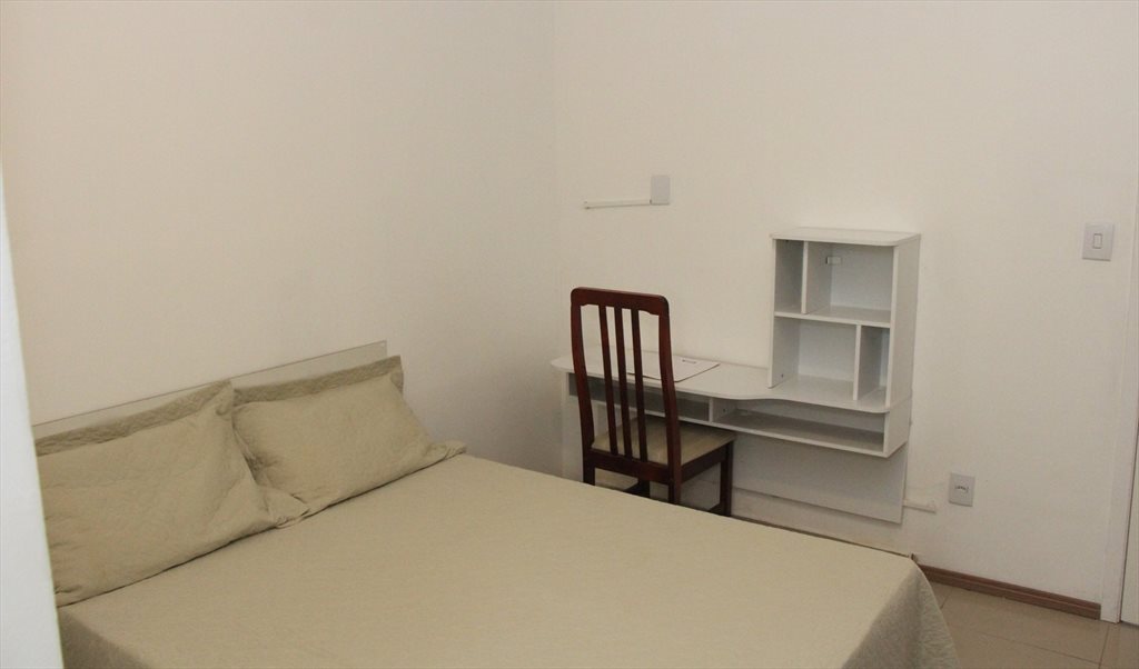 Quarto com cama de casal, mesa, cadeira, armário, em uma casa com banheiro, sala, cozinha, churrasqueira compartilhadas