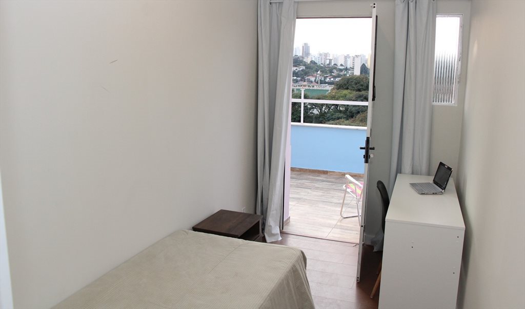 Quarto com cama de solteiro, mesa, cadeira, armário, varanda grande, linda vista em uma casa com banheiro, sala, cozinha, churrasqueira compartilhadas