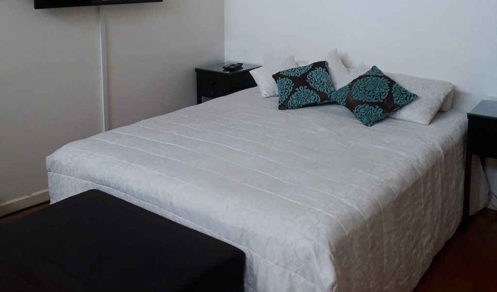 quarto amplo ,arejado,mobiliado ,com armario embutido ,cama box de casal,poltrona, frigobar, mesa de estudo com internet ,abajur e ventilador de teto.
