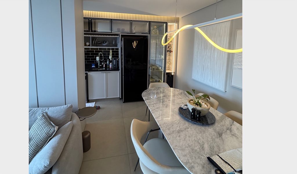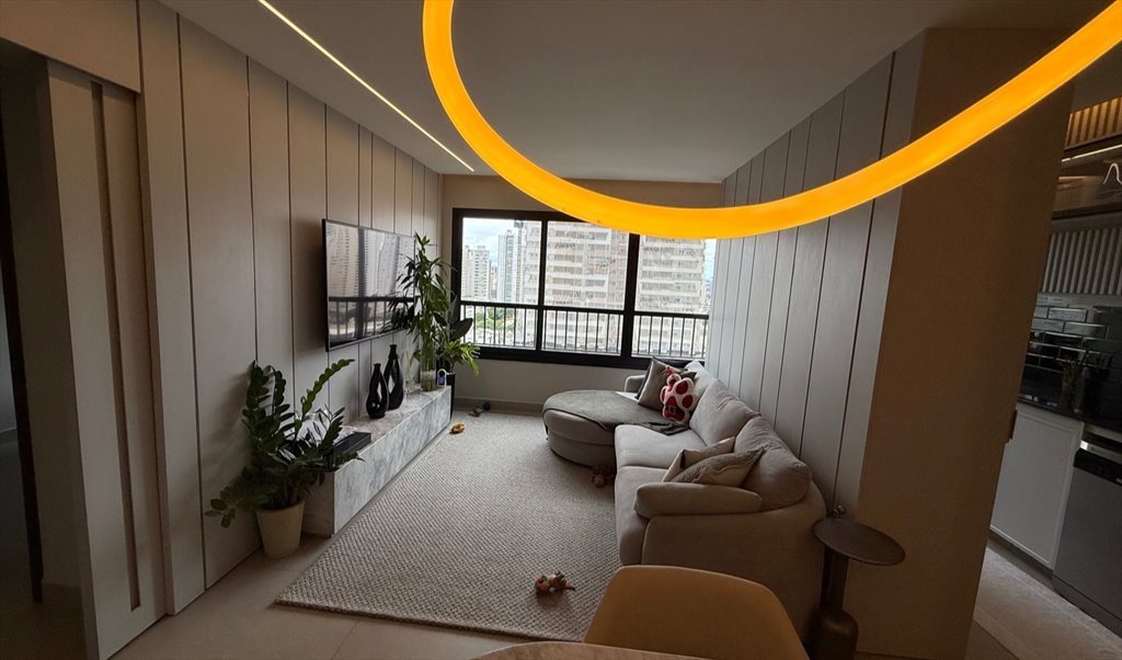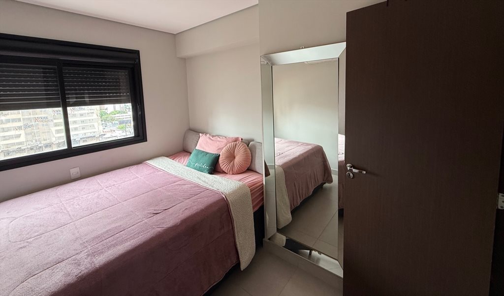 quarto aconchegante com colchão novíssimo, armários planejados, banheiro privativo, sala integrada que recebe sol, cozinha equipada de ponta a ponta, geladeira, TV 4k, lava-louça e máquina lava e seca, ar condicionado;