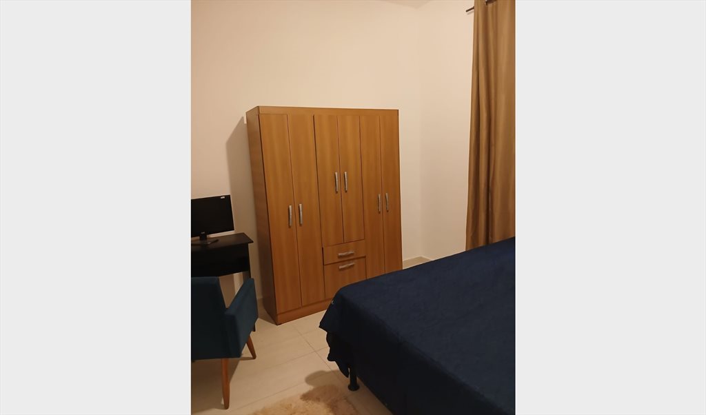 Quarto individual mobiliado com armário, cama de casal, mesa e cadeira de trabalho (Novos), ventilador de teto, ar condicionado e TV.