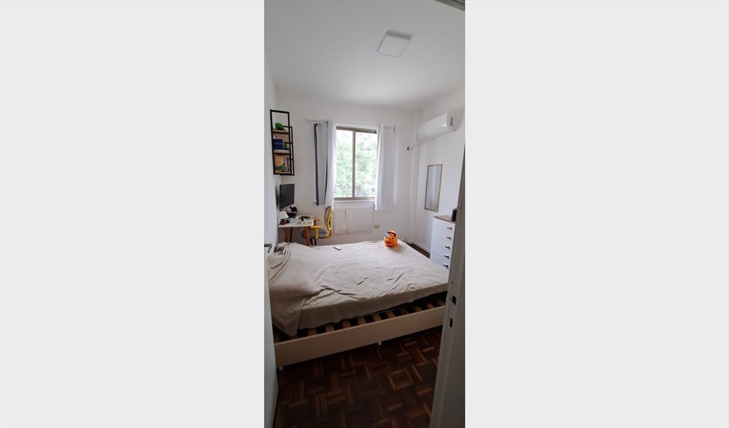 O quarto conta com uma cama de casal, cômodas, ar condicionado, escrivaninha, cadeira, prateleiras.