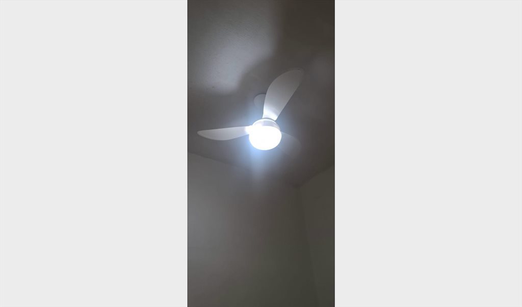 O quarto disponível fica na dependência, já com guarda-roupa, colchão e cama, ventilador de teto, mesinha para computador.