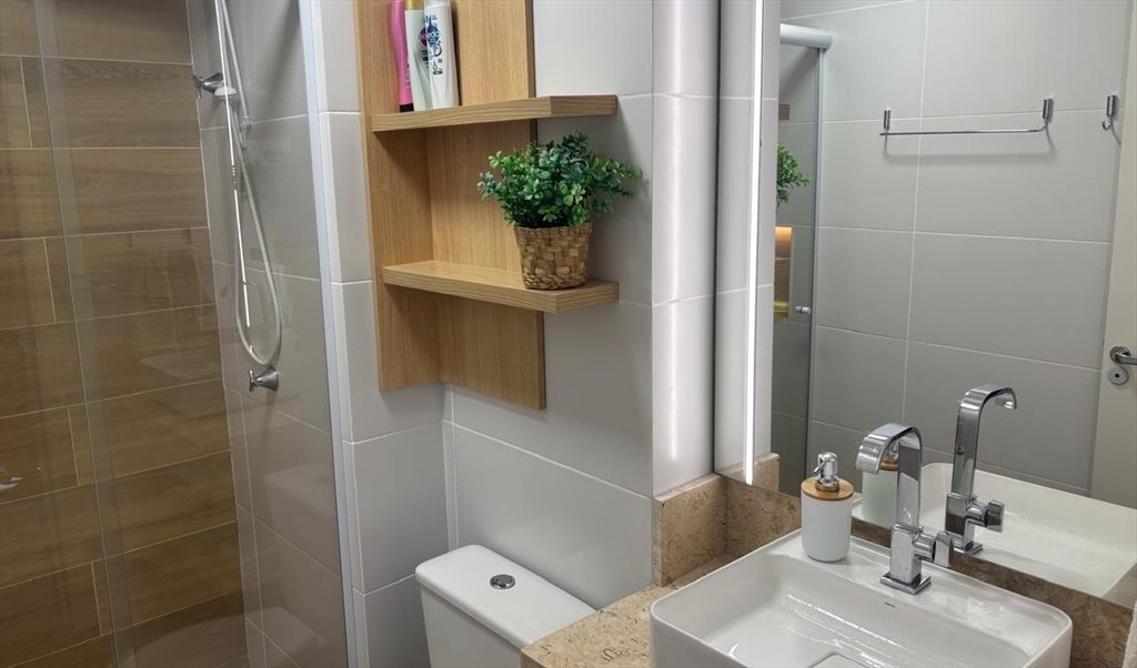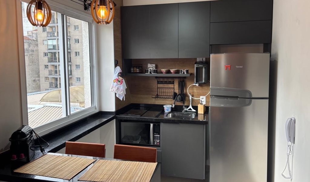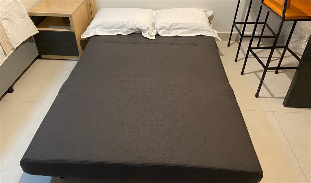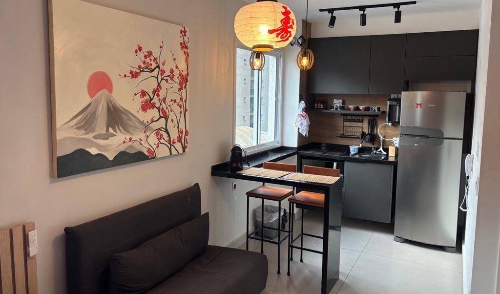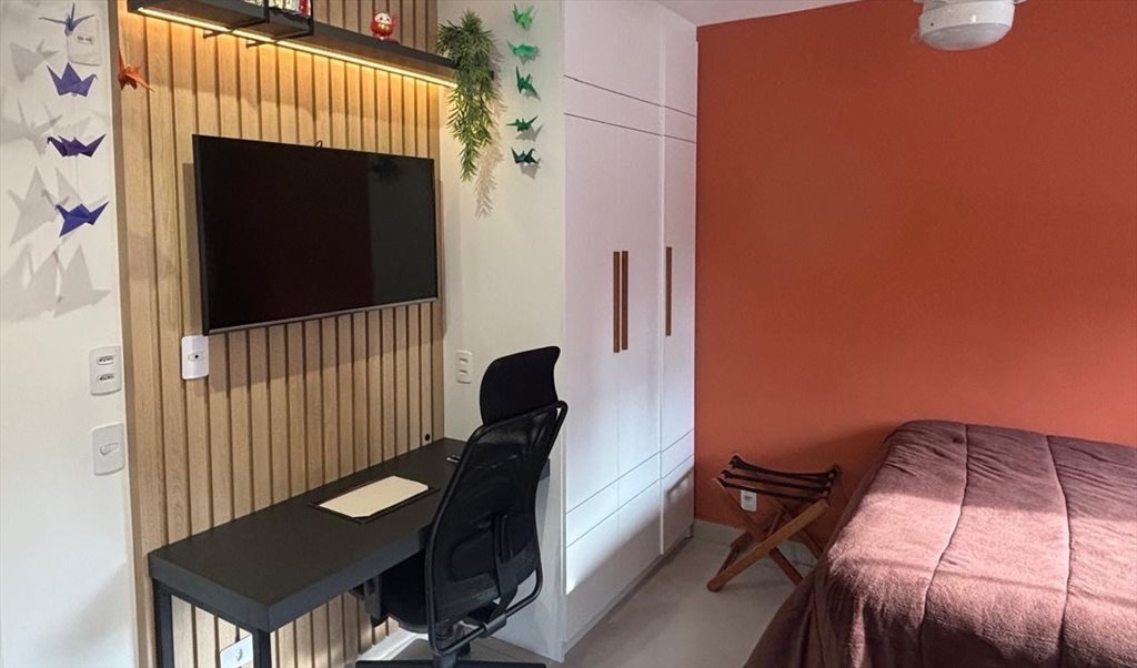 Studio complemente mobiliado e finamente decorado! Possui uma cama de casal queen e um sofá cama. Todo mobiliado com fogão por indução, microondas, tv smart, Nespresso, filtro, sanduicheira, ferro de passar, fechadura digital,… Banheiro privativo. Prédio novo com piscina, academia, salão de festa, lavanderia, salão de festas, brinquedoteca, entre outros.