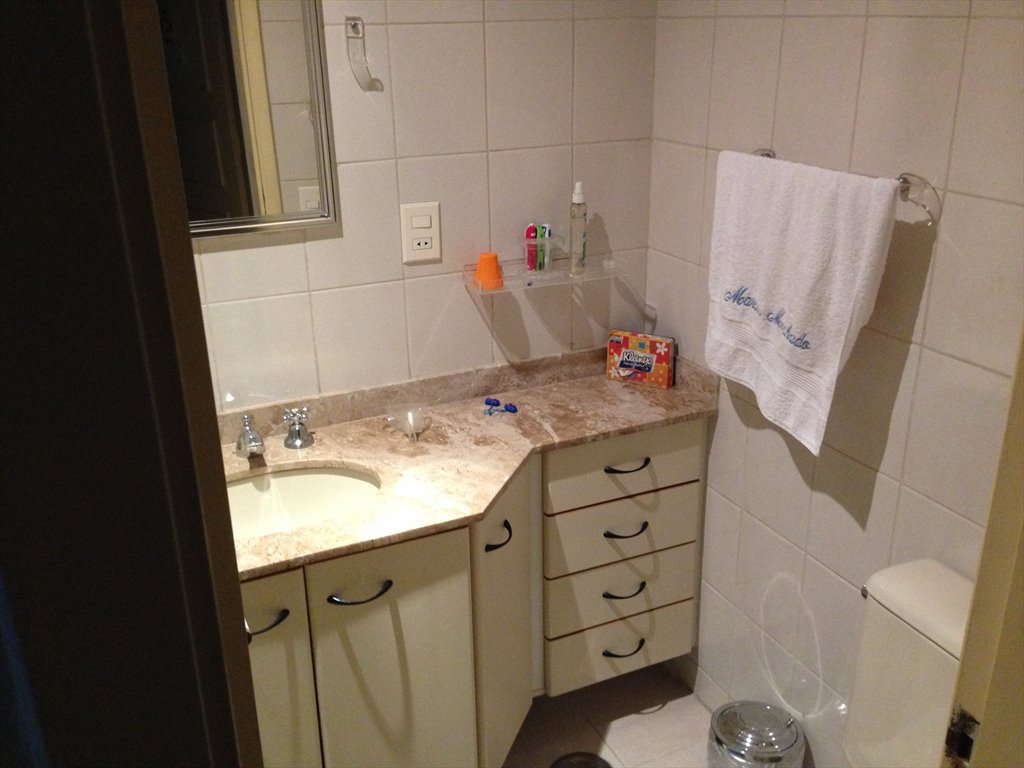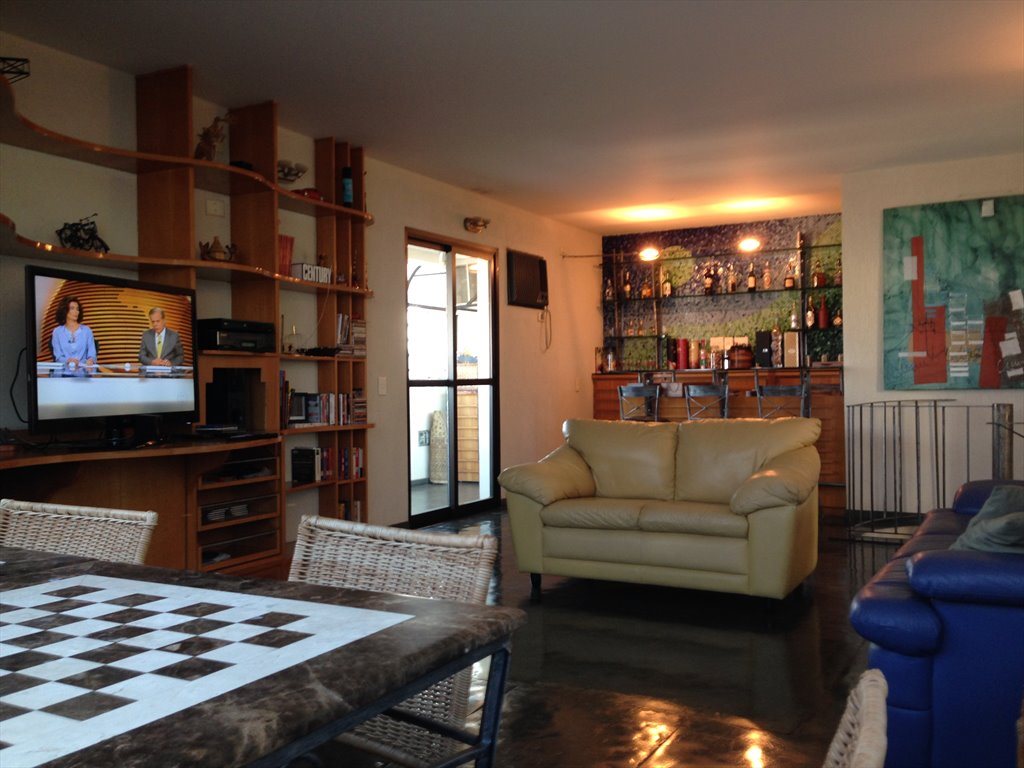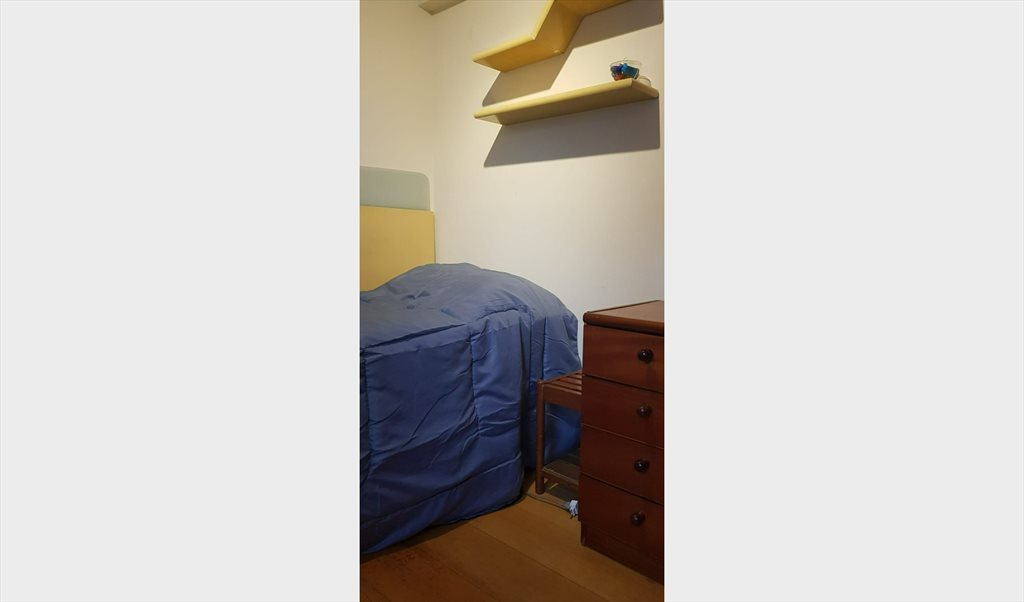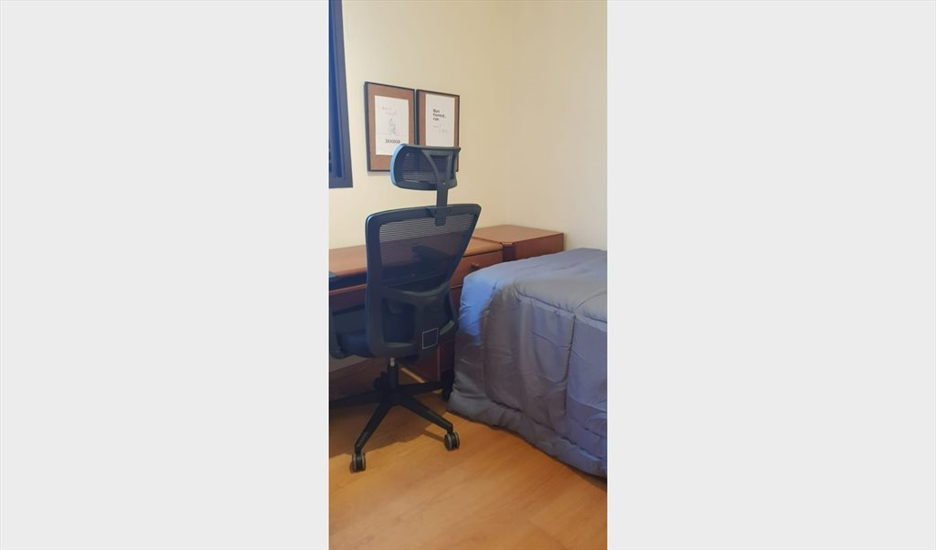 Quarto com cama box e colchão confortável em cobertura duplex. Mesa de trabalho com cadeira ergonômica e espaçosos armários embutidos no quarto. Livre acesso à sala, cozinha, lavanderia, piscina e demais áreas do apartamento. O banheiro é compartilhado, mas com espaço para suas coisas pessoais, assim como na cozinha. Vaga de garagem coberta disponível.