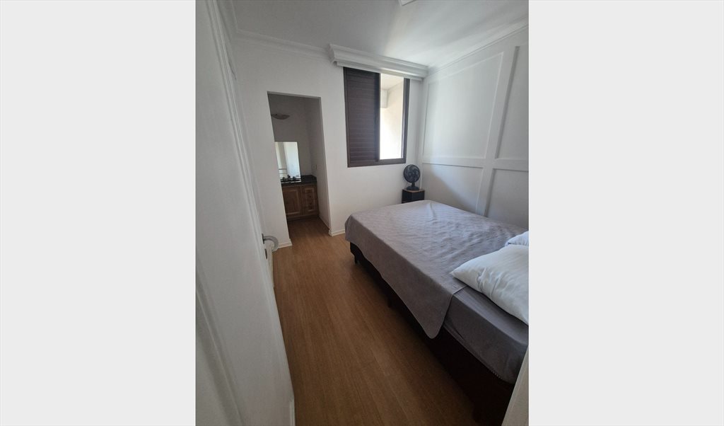 Suíte Individual mobiliada (podemos negociar retirada) em apartamento bem localizado em Moema, do Lado da Estação Moema da linha Lilás e na rua do Shopping Ibirapuera. O quarto tem cama de casal e armário, em um ambiente confortável e funcional.