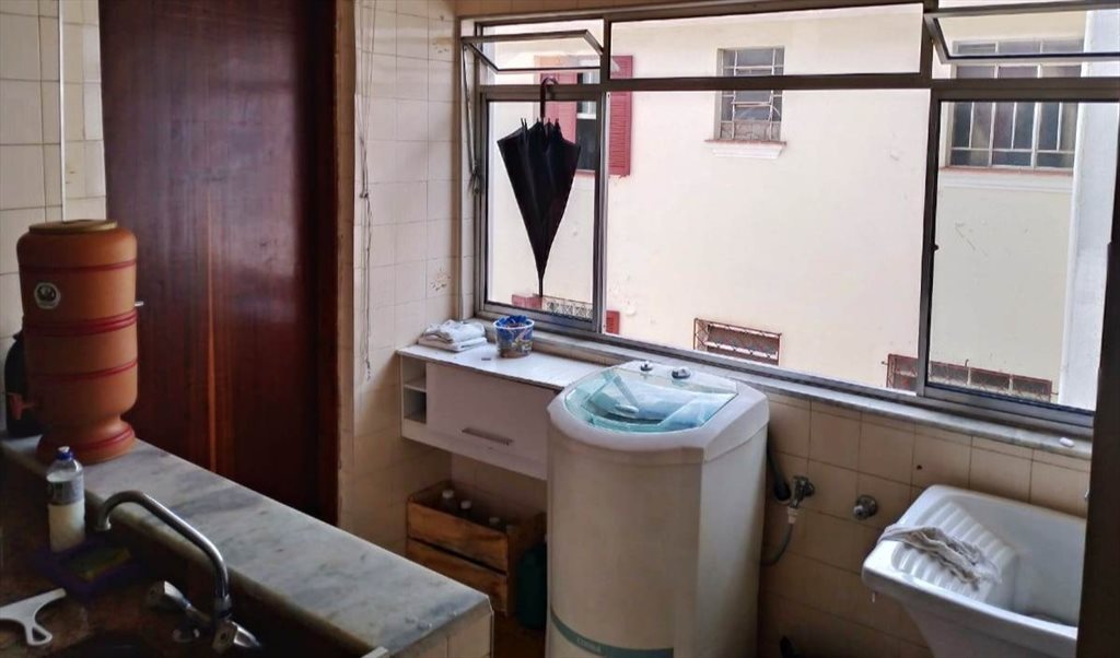 e área de serviços com maquina de lavar compartilhados.
