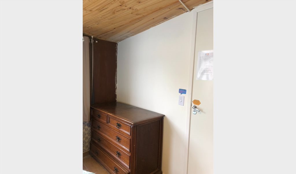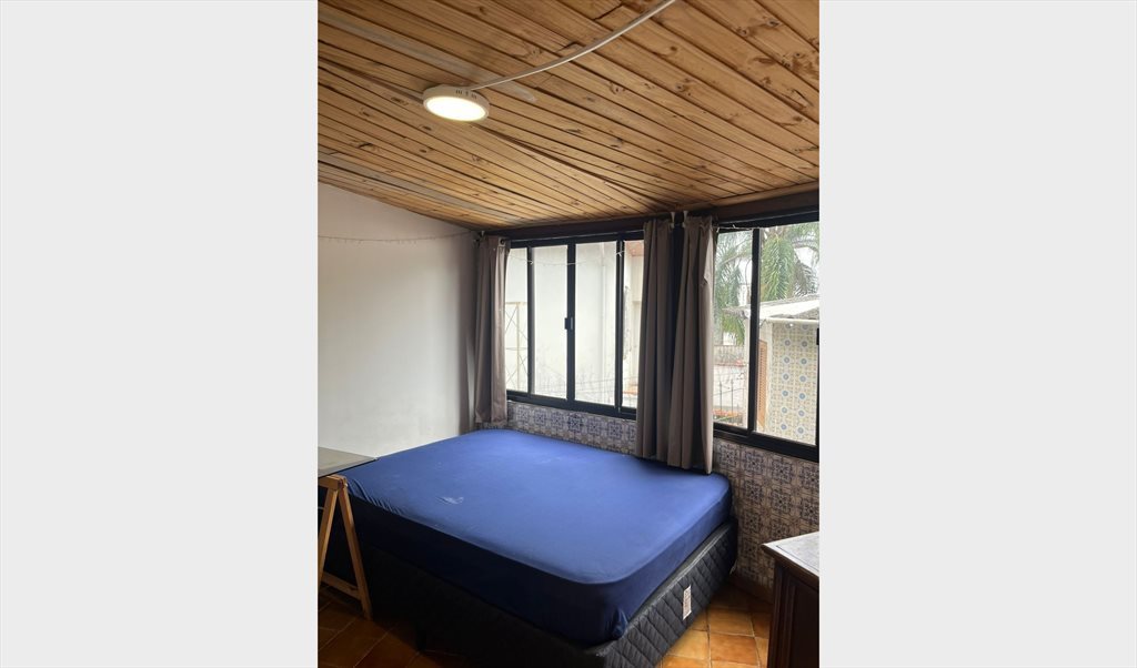 Quarto com cama de casal, mesa, cadeira, armário, em uma casa com banheiro, sala, cozinha, churrasqueira compartilhadas