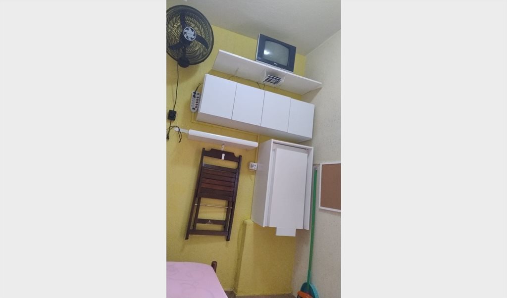 QUARTO INDIVIDUAL COMPLETO: cama solteiro, colchão (podemos emprestar seminovo), armário, 15 cabides, televisão, conversor tv 33 canais, ventilador, mesa, cadeira, frigobar COM CONGELADOR, lixeira, cesto, varal, prato, copo, caneca, talheres, prateleira, panelas, panelas, espelho, e wifi apartamento todo e quarto 700 megas fibra ótica e 5G.