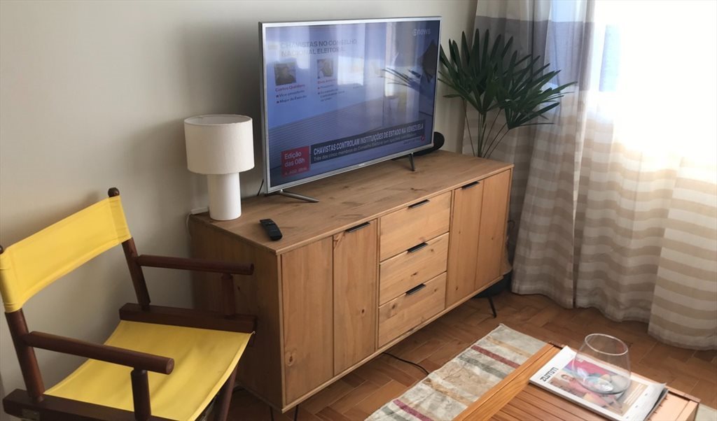 O quarto conta com guarda-roupa novo, cama de casal box com baú, ar condicionado (quente/frio), televisão de 32 polegadas, cortina, mesa lateral, luminária, banqueta baixa de apoio, espaço para escrivaninha, entre outras comodidades.