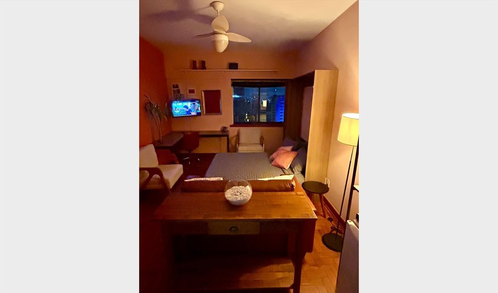 Cozy and well-decorated studio apartment on the 20th floor, with a double bed, desk, and pleasant lighting. Equipped kitchenette, mini-fridge, and private bathroom. Building with 24-hour concierge and security, located opposite the Hotel Nacional Inn Jaraguá SP, in the same building as the Estadão snack bar, with easy access to transportation, shops, and cultural attractions in São Paulo — ideal for short stays or remote work. Daily rates from R$ 207.00.